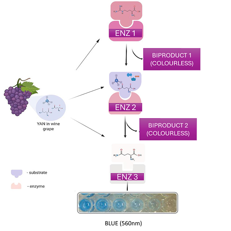 The YAN biosensor provides a 3 step enzyme cascade correlated to the amount of YAN (both Ammonia and primary amino nitrogen).  A tablet format will enable a winemaker to test for YAN easily, with one simple addition of a tablet to a wine or grape sample without the need for the sample to be decolourised.  The validation data demonstrates excellent correlation with traditional 2 step measurements for YAN and can be easily employed in the vineyard without the need for advanced testing equipment or scientific expertise.  This was developed and will be commercialised in conjunction with the University of Wellington.
