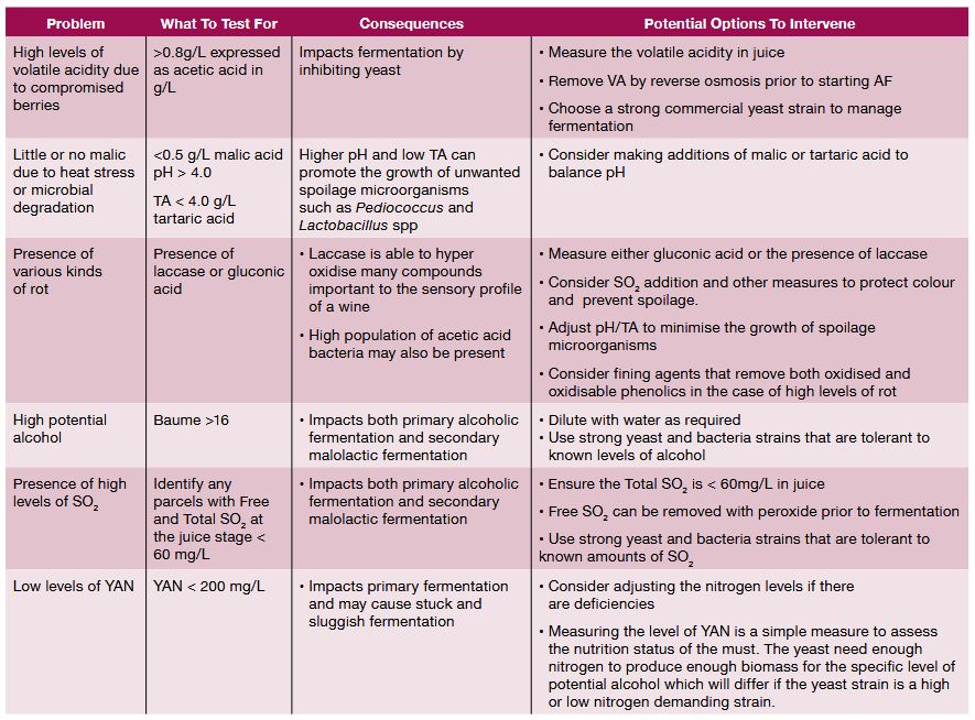 Following on from the above, juice chemistry including sugar level, SO₂, pH and volatile acidity may impact alcoholic fermentation. A very high sugar level may cause osmotic stress at the beginning of fermentation and lead to high levels of ethanol at the end of fermentation. Saccharomyces cerevisiae are sensitive to SO₂, ethanol >10% as well as very low pH and volatile acidity above 0.8 g/L of acetic acid. The levels of sensitivity are strain specific. Knowledge of these factors is essential if the aim is to intervene as little as possible.
