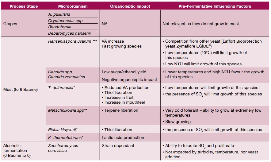 Typically, species such as Hanseniaspora, Kloeckera, Pichia, Candida, and Metschnikowia genera dominate the first stage of uninoculated fermentations. Species such as Torulaspora delbrueckii, Kluyveromyces spp., Zygosaccharomyces bailli, Schizosaccharomyces pombe and Issatchenkia spp., may also be present (Table 2). These species start the fermentation and proliferate up to 10⁶- 10⁷ cells/mL until factors such as alcohol, nutrient limitation and competition cause a decline in population. Whilst some of these non-Saccharomyces species give desirable attributes to a wine, some are more likely to produce undesirable sulfur compounds and/or volatile acidity (Albertin et al. 2014). Typically, half way through the fermentation, Saccharomyces cerevisiae takes over the fermentation (Comitini et al. 2017).